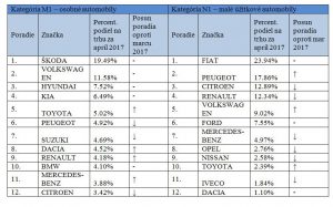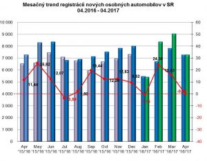 V apríli 2017 klesli počty zaregistrovaných nových osobných automobilov (kategória M1) na Slovensku na 7 272 vozidiel , čo predstavuje oproti minulému roku mierny pokles na úrovni 0,08 percenta.