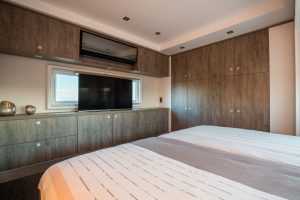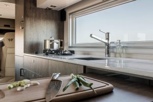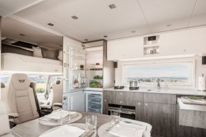 Spálne a obývací priestor sú výsuvné, takže si na nedostatok miesta bude sťažovať skutočne len málokto. Kuchyňa ponúka slušne veľkú linku a vysokú chladničku s mrazákom, dvojplatňový plynový varič a kombinovanú trúbu. V obývacom priestore je surround sound systém Bose a 32″ televízia. Pre zvláštny prípad sa spálni nachádza aj druhá televízia s 40″ obrazovkou.