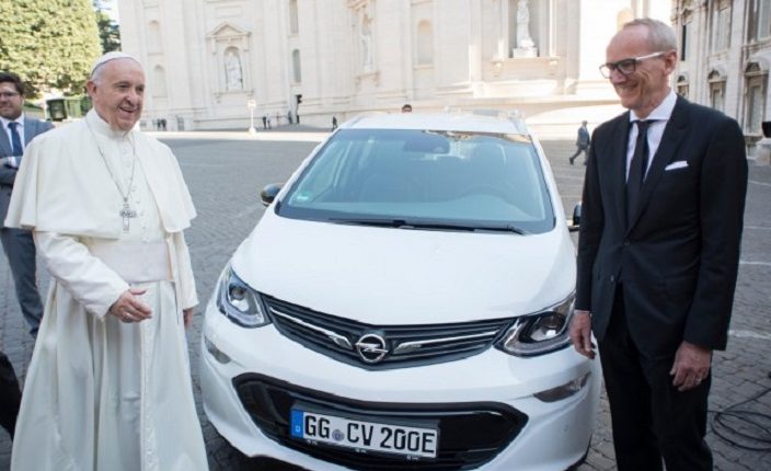 Vtedajší Generálny riaditeľ spoločnosti Opel Karl-Thomas Neumann odovzdal kľúče od nového vozidla Opel Ampera-e pápežovi Františkovi počas konferencie “Laudato Sì: Udržateľnosť komunikácie a inovácie”.