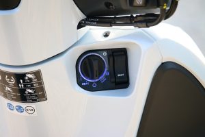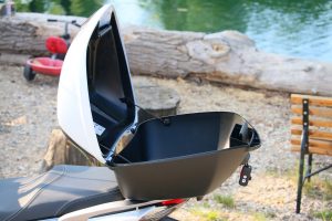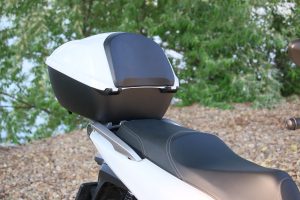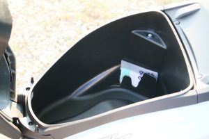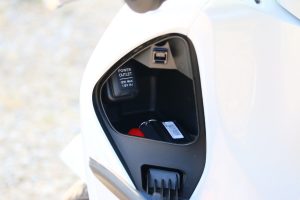 Z dodatočnej výbavy spomeniem aj veľký veterný štít. Ten síce perfektne bránil telo pred náporom vetra a hmyzu, ale nepríjemne sa leskol a odrážali sa v ňom rôzne artefakty, ktoré pri jazde pôsobili rušivo. Ja ako vyšší jazdec som mal navyše jeho vrchnú hranu akurát v zornom poli. V meste by som asi štít radšej obetoval. Z komfortnej výbavy spomeniem ešte tajnú schránku pod ľavým riadidlom, v ktorej sa ukrýva aj 12 V zásuvka. To je perfektná vec.