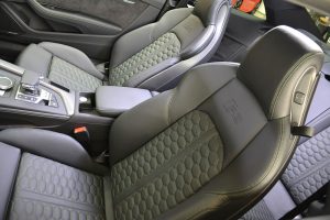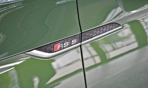 Zelená RS 5 pôsobí skutočne atraktívne, najmä v kombinácii s čiernymi lesklými prvkami, za ktoré si záujemca priplatí ďalších 550 eur. Päťlúčové dvadsaťpalcové kolesá stoja 2000 eur, pričom štandardne má RS 5 „devätenástky“. Športový výfuk s dvojicou elipsovitých koncoviek tiež nie je v základe, zaplatíte za neho ďalších 1200 eur. Anatomické sedačky v kabíne majú efektný voštinový vzor.
