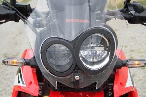 CRF 250 Rally nie je čistokrvný off-road, ale cestno-športový motocykel v štýle Adventure – tvrdí Honda. A má pravdu, vďaka mäkkému, ale pritom sebaistému podvozku som sa cítil na ceste veľmi príjemne. Stav našich ciest ma zrazu vôbec netrápil. Skutočné kvality odhalil podvozok až v teréne. Neskutočne rýchlo, presne a ľahko ho kopíruje. Akoby kolesá boli k zemi prilepené a samotná motorka sa vznášala vo vzduchu. Samozrejme, až kým neskočíte. Vpredu je upside-down vidlica Showa s priemerom 43 mm, ktorá poskytuje zdvih 250 mm, vzadu zasa rameno Pro-Link s jednoplášťovým tlmičom Showa s priemerom 40 mm a zdvihom 265 mm. Nechýba ochrana klzákov predných tlmičov, žltá farba valcov je akási čerešnička na torte. Brzdy sa dobre dávkujú, pochvaľoval som si, že zadná je veľmi účinná. ABS sa montuje sériovo, pre zadné koleso sa dá vypnúť. Pneumatiky sa dokážu zahryznúť do akéhokoľvek terénu a zároveň v ňom dokážu viesť stopu. Celý podvozok ako balík funguje fantasticky. Jazde v teréne zodpovedá úzka stavba stroja, dlhé a rovné sedadlo, široké riadidlá aj „zubaté“ stúpačky (bez gumených vložiek), na ktorých sa vám čižmy nešmyknú ani za mokra a dokonca ani vtedy, keď máte na podrážke blato. Z pohľadu pripravenosti stroja na jazdu vo vážnom teréne ma sklamalo, že ochranný kryt motora je iba plastový. Tu by sa hliník fakt zišiel. Ak pri potulkách zabudnete na čas (v lese sa vie sakramentsky rýchlo zatmieť), tak sa vám určite zídu účinné LED svetlomety. Vďaka tomu, že sú asymetrické a cez prstenec imitujúci karbón vsadené do plexištítu, vyzerá motorka ako mucha z Fukušimy – postihnutá radiáciou. Ale je to cool. Mimochodom, spomínaný prstenec imitujúci karbón je v skutočnosti mäkký, takže odolá prípadným úderom alebo kamienkom. A dodávam, že ten plexištít nie je len na ozdobu, ale veľmi dobre chráni.