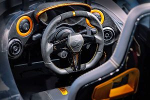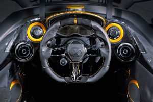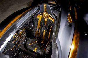 Zlatú farbu potom nájdeme aj na palubnej doske, v bočných paneloch, na volante a zlatá sa dokonca stala aj farbou bezpečnostných pásov. Kde nie je použitá zlatá, tam sa objavuje kombinácie kože a Alcantary, ako je zrejmé napríklad na volante alebo na koberečekoch. Ani tu však prirodzene nechýba aspoň zlaté prešívanie.