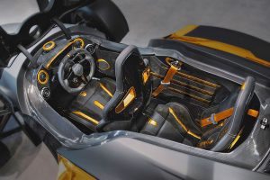 Šofér a jeden spolucestujúcí sedia v úzkom kokpite za sebou pekne v pozdĺžnej ose vozu. Základom je hliníkový podvozok, ktorý je navrhnutý tak, aby vydržal rovnakú záťaž ako skutočný pretekársky voz a pri prípadnom náraze bol schopný ochrániť posádku.