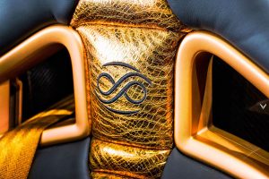 Zlatú farbu potom nájdeme aj na palubnej doske, v bočných paneloch, na volante a zlatá sa dokonca stala aj farbou bezpečnostných pásov. Kde nie je použitá zlatá, tam sa objavuje kombinácie kože a Alcantary, ako je zrejmé napríklad na volante alebo na koberečekoch. Ani tu však prirodzene nechýba aspoň zlaté prešívanie.