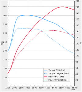 Veľmi zaujímavý je priebeh oboch výkonových kriviek, kedy v najčastejšie využívanom nižšom a strednom spektre otáčok je vidieť priepastný rozdiel medzi štandardným motorom  a motorom po úprave firmou BSR. Súčasťou základnej ceny tohto produktu je BSR záruka na pohonné ústrojenstvo a ale aj záruka BSR Tuning.