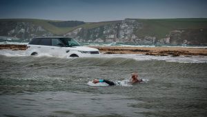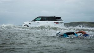 V októbri minulého roka zasa Range Rover Sport potvrdil, že je obojživelníkom a dobre sa cíti aj vo vode. Táto promotion akcia sa uskutočnila v Anglicku a jej účelom bolo doraziť na ostrov Brugh z pláže Bantham skôr, než tam dopláva olympijská plavkyňa Kerri-Anne Payneová spolu s atlétom a dobrodruhom v jednej osobe Rossom Edgleyom. Za normálnych okolností by títo dvaja elitní športovci neboli pre nový Range Rover Sport P400e PHEV prakticky žiadnou konkurenciou, napokon pod jeho kapotou sa ukrýval motor o s výkonom 404 koní a krútiacim momentom 640 Nm. Proti automobilu však stál ešte jeden súper – matka príroda a s ňou silný príliv.