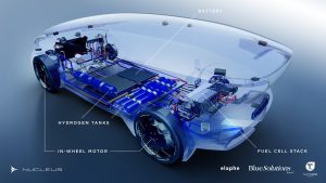 Vozidlo je navrhnutý s elektrickým pohonom na vodíkové články. Motory by mali byť zabudované v každom zo štyroch kolies a nechýbajú ani elektrické články. Riadenie je samozrejme autonómne a to na najvyššej úrovní teda bez klasického volantu a možnosti klasického riadenia. Jednoducho vízia budúcnosti, ktorá už klope na dvere.