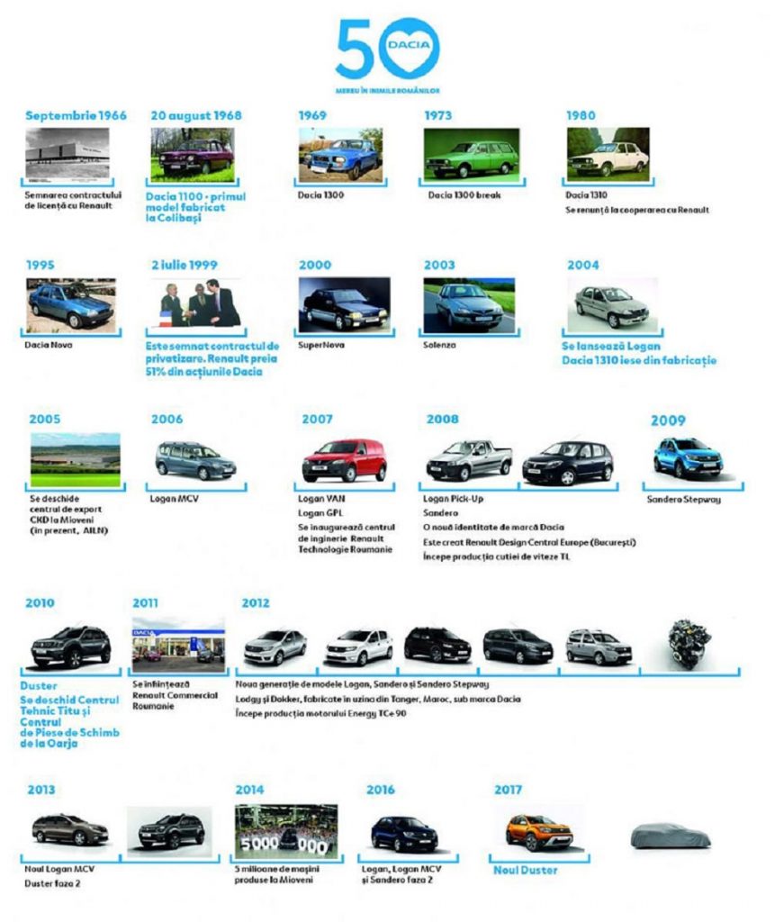 Zdá sa to skoro neuveriteľné, ale značka Dacia je tu s nami už dlhých 50 rokov. Presne toľko času ubehlo od výstavby kľúčového podniku v Mioveni a hlavne odvtedy, čo z výrobnej linky zišiel prvý automobil Dacia 1100 na báze licenčného vozidla Renault 8. Vzniklo ich celkovo 44 000. Od roku 1969 však prišla na rad legendárna Dacia 1 300, teda Renault 12, v tom čase úradujúce európske Auto roka, a stala sa symbolom rumunského automobilového priemyslu. V nasledujúcich piatich rokoch tu Francúzi preinvestovali 489 miliónov eur a svoj podiel zvýšili na 99,3 percenta.