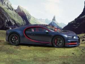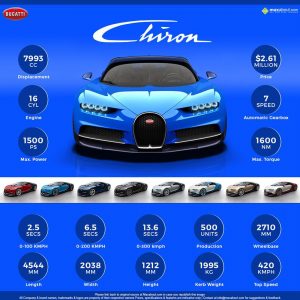 Podľa plánu sa má z modelu Chiron vyrobiť celkovo päťsto kusov, pričom odborníci a inžinieri z Buggati zatiaľ vyprodukovali pätinu exemplárov. Jubilejný kus smerujúci na Blízky východ kombinuje odhalenú štruktúru tmavo modrého karbónu s matným lakom karosérie. Je to vôbec po prvý raz, čo Bugatti použilo spomínanú farebnú kombináciu.