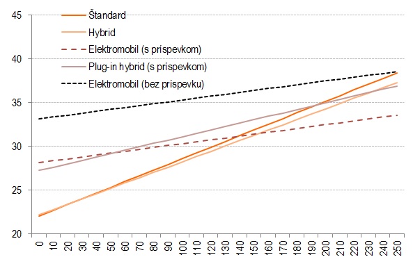 Z nasledujúceho grafu vyplýva, že v prípade porovnateľných vozidiel nižšej strednej triedy, tzv. “kompaktov”, sa po započítaní štátnej dotácie (5 000 €) vyrovnajú celkové náklady (obstarávacia cena + prevádzkové náklady) plne elektrických a bežných automobilov v priemere po najazdení 140 000 km.