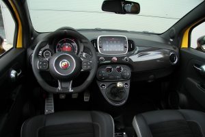 Obratnosť Twinga GT je taká návyková, že keď som si presadol do Abarthu 595 Competizione, chvíľu som vyzeral ako čerstvý držiteľ vodičského oprávnenia. Mnoho manévrov som musel robiť na viackrát. Ale nie som na vine iba ja. Abarth v skutočnosti napriek svojim piadirozmerom nie je veľmi obratný. Ani odkladacích priestorov v ňom nie je toľko a nie sú ani také praktické. Ak ste čítali test tohto Abarthu od môjho kolegu Peťa Vargu (AM 10/2017), nasledujúce riadky vás možno trochu zmätú. Jemu totiž toto auto sadlo ako uliate. Ja, žiaľ, to isté povedať nemôžem. Začnem sedadlami. Úžasné Sabelty s karbónovou škrupinou vyzerajú perfektne, ale pre mňa sú príliš široké, s tvrdou a zle tvarovanou chrbtovou časťou a úplne im chýba opora ramien. Opierka hlavy je tiež strašne ďaleko. Ďalej je tu priestor nad hlavou, resp. jeho nedostatok. Vo verzii s otváracou strechou som sa totiž hlavou dotýkal strechy a nebol to vôbec príjemný pocit. Ľuďom s výškou nad 190 cm teda odporúčam vynechať otváraciu strechu a určite si treba posed v aute vyskúšať. Ak plánujete s autom jazdiť na okruhu, je možné, že s prilbou by ste sa doň nezmestili už vôbec. Posed na zadných sedadlách je vyslovene núdzový. Čo sa mi však ráta, je perfektná pozícia za volantom (ak si odmyslím nedostatok priestoru nad hlavou). Pedále sú perfektne rozmiestnené na medziplyny a radiaca páka je hneď pri volante. To sa mi veľmi páči. Tiež sa mi páči až obsesívna pozornosť venovaná detailom: logá škorpióna, červené tiahla sklápania sedadiel, karbón kade-tade… Vidno, že najviac času nad týmto autom sa ušlo práve dizajnérom.