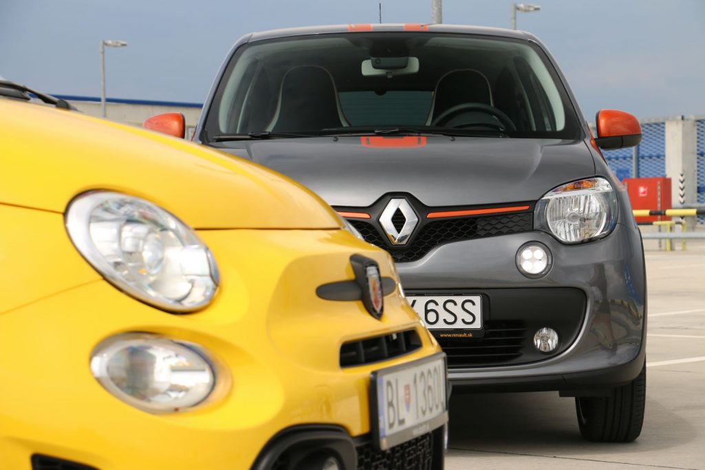 Poďme konečne jazdiť. Renault Twingo GT je hneď po pár metroch odlišný od „bežnej“ verzie. Jeho motor je oveľa ochotnejší a som až prekvapený, aký sa zdá byť živý. Síce tu nie je otáčkomer, ale mám pocit, že ťahá už od nízkych otáčok. Moje Twingo je vybavené šesťstupňovou dvojspojkovou prevodovkou EDC, ktorej logika radenia je prosto famózna. Pri ostrejšom brzdení okamžite podraďuje, takže pri výjazde už máte zaradený správny prevodový stupeň. Radí rýchlo a pri každom preradení to trochu zaduní vo výfuku. Manuálny režim som ani nepotreboval využívať, ale potešilo by ma, keby mal rovnakú logiku ako v Cliu R.S. Teraz sa radí na vyššie stupne tlačením páky dopredu a podraďuje smerom dozadu, čo nie je intuitívne. Veľmi chválim aj podvozok. Auto pre svoj krátky rázvor a takmer neexistujúce previsy síce nemôžem nazvať pokojné, ale vždy, keď som ho zoznámil so zákrutou, fungovalo výborne. Predná náprava má perfektný grip a odozva na riadenie je famózna. Škoda toho nevypínateľného ESC. Je pravda, že dovolí jemné šmyky, ale myslím, že Renault mohol byť odvážnejší. Naladenie podvozka je veľmi neutrálne, až mám pocit, že sa inžinieri snažili čo najviac „poprieť“ koncepciu auta s motorom vzadu. Aj tak však jazdí výborne a na prepletanie sa mestskými uličkami si neviem predstaviť nič lepšie. Dokonca ani tá automatická prevodovka mi tu nevadila. Páčilo by sa mi, keby malo Twingo GT výraznejší zvuk z výfuku. Myslím, že trojvalec s krátkym športovým výfukom by mohol znieť veľmi zaujímavo. Abarth 595 Competizione je po Twingu GT hotové zviera. Už len jeho zvuk z výfuku akoby pochádzal z dvojnásobne veľkého motora. V nízkych otáčkach v ňom dokonca počuť aj jemné pískanie turbíny! Po pridaní plynu sa chvíľu nič poriadne nedeje, ale potom treba veru pevne držať volant, lebo Abarth začne dosť zbesilo zrýchľovať a dosť pri tom ťahá za ruky. Toto je auto pre chlapov! Vďaka samosvoru má výbornú trakciu. Nechápem, prečo nemá vypnuteľnú stabilizáciu, najmä ak jej zásahy sú dosť brutálne. Podvozok je dosť tvrdý a prepožičiava autu veľkú stabilitu. Na mňa možno až príliš. Kolega Peťo sa so mnou síce hádal, ale mne sa zdal Abarth trochu nedotáčavý a nevedel som ho plynom prinútiť utiahnuť líniu. Na brzdách sa mi to občas podarilo, ale môj celkový pocit je taký, že Abarth si treba užívať najmä v oblasti akcelerácie, ideálne medzi nejakými budovami či v tuneli, kde sa naplno rozoznie jeho výfuk. Aj pomalá jazda v meste je vďaka úžasne naladenému výfuku doslova zážitkom. Do serpentín by som teda paradoxne radšej zobral Twingo GT. Bodaj by sa dal skombinovať motor Abarthu s podovzkom a koncepciou Twinga GT. K tomu ešte vypínateľná stabilizácia, samosvor… Ale to už sme v ríši snov.