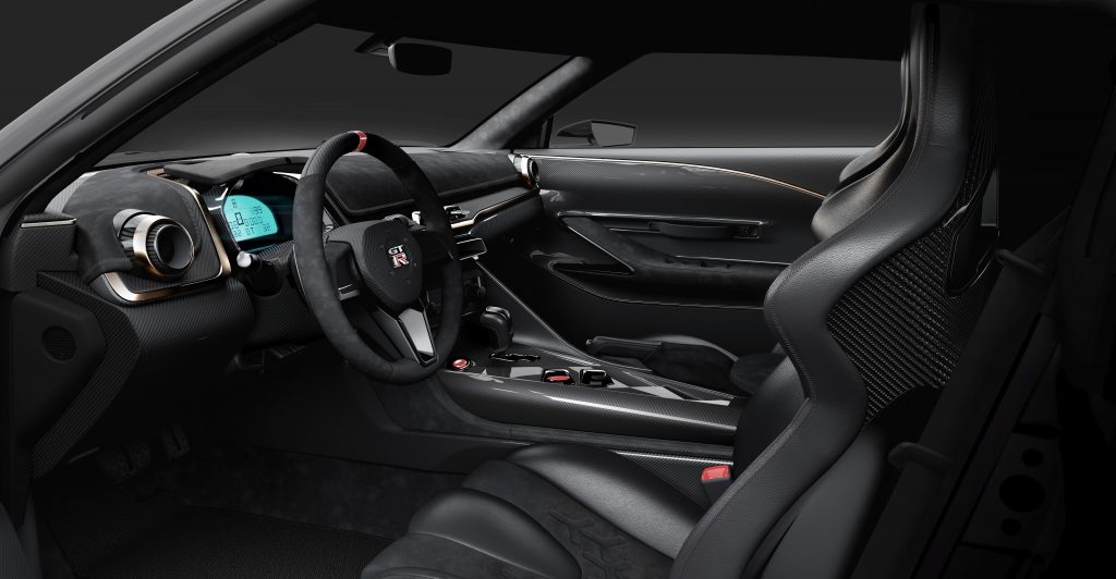 Moderne ladený interiér dokonale odráža ducha modelu Nissan GT-R50 by Italdesign. Na stredovej konzole, prístrojovej doske a obložení dverí sa striedajú dva rôzne povrchy z uhlíkových vlákien, zatiaľ čo sedadlá sú potiahnuté kombináciou čierneho materiálu Alcantara a jemnej čierne talianskej kože.