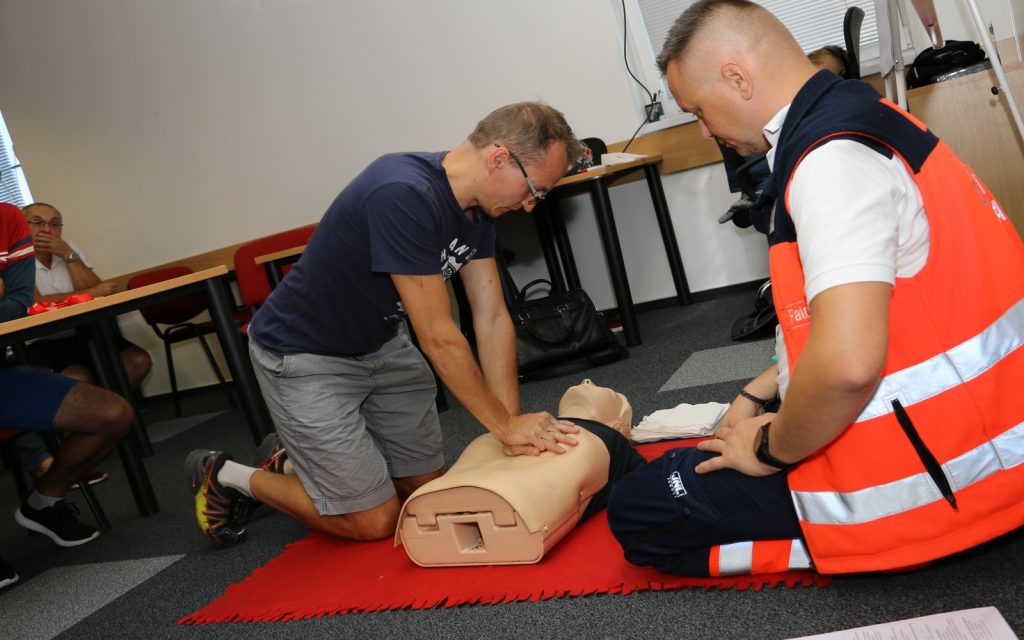 Pri poskytovaní prvej pomoci sa počíta každá sekunda, preto po vedomostnom teste z poskytovania prvej pomoci, ktorý bol ďalšou disciplínou súťaže, nasledovala voľná diskusia s Petrom Lakomým, ako aj možnosť vyskúšať si masáž srdca a dýchanie z úst do úst na figuríne. Nasledovala prehliadka sanitky, ako aj nácvik hasenia požiaru hasiacim prístrojom. Veľmi nás teší, že z maximálneho počtu 20 bodov bolo medzi súťažiacimi minimálne skóre až 16 bodov. Plný počet získalo až 8 súťažiacich. Perfektné!