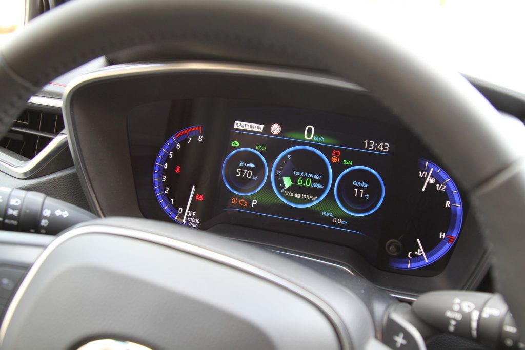 Nie je žiadnym tajomstvom, že v Toyote namiesto dieselov stavajú na hybridoch. V prípade Corolly budú k dispozícii dve verzie – prvú už poznáme, stavia na 1,8-litrovom motore, druhá je celkom nová a ako hlavný zdroj energie využíva dvojlitrový benzínový motor. Práve ona najlepšie reflektuje snahy konštruktérov urobiť z Corolly auto pre nadšených vodičov a práve ňou boli vybavené všetky autá, ktoré sme mali k dispozícii. Benzínový dvojliter pracuje s Atkinsonovým cyklom, vďaka čomu dosahuje účinnosť až 41 %, čo je na benzínový motor nevídané neslýchané. Motor má väčší uhol rozovretia ventilov, väčší prierez sacích ventilov, duálne vstrekovanie paliva (jedna zostava vstrekovačov vstrekuje palivo pred sacie ventily, druhá priamo do jednotlivých valcov), rýchlejšie spaľovanie, vysoký kompresný pomer (14:1), dlhý zdvih piestov, elektrický termostat… Podporuje ho elektromotor napájaný z NiMH akumulátora. EV režim sa posunul až na 115 km/h. Poznamenávam, že verzia 1,8 hybrid má Li-Ion akumulátor. Hybridný systém kompletizuje známa e-CVT prevodovka s dvoma elektromotormi a výkonová jednotka. Kombinovaný výkon hybridného systému je 132 kW (180 k), resp. 192 Nm a tento výkonový potenciál je aj cítiť. Pri bežnej jazde sa hnací systém správa veľmi prirodzene – je tichý, motor zbytočne nevytáča a plynulú zmenu prevodového pomeru ani nevnímate. Nezbavil sa však vysávačového efektu pri silnejšej akcelerácii. Keď sa ho chcete zbaviť, môžete radiť manuálne šesť prednastavených stupňov páčkami pod volantom alebo voličom. Kým však nepresuniete volič doľava – do polohy manuálneho radenia, tak na povely páčok pod volantom reaguje e-CVT prevodovka po svojom. Najmä pri radení smerom nahor vaše povely jednoducho nevykoná.
