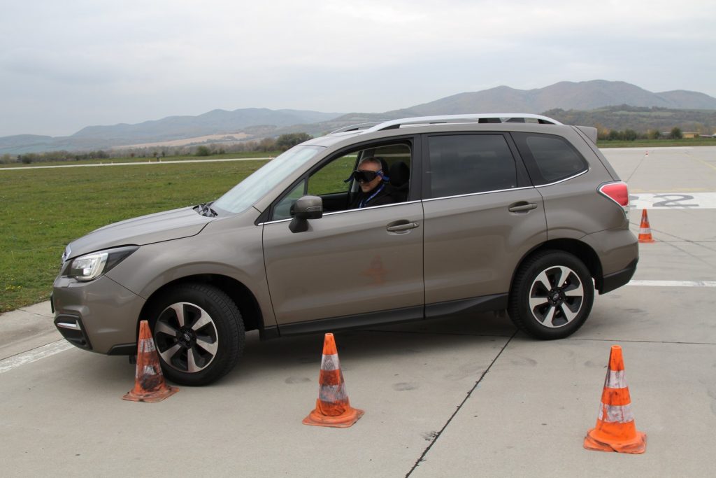 Prvou bol parkovací hlavolam. Ten spočíval v tom, že sme mali vojsť do malého štvorca, otočiť sa tam o 360 stupňov na čo najmenej krokov a vyjsť na druhej strane. Priznám sa, pri prvom pokuse som potreboval na otočenie sa v štvorci až 18 krokov – 18× dopredu a dozadu. Správnou stratégiou a tesným využívaním plochy vytýčeného sa to však dalo urobiť na 7 krokov. Aby organizátor zvýšil edukatívnu hodnotu tejto disciplíny, posledné kolo som absolvoval s tzv. opileckými okuliarmi. Tie deformáciou obrazu simulujú stav opitosti. Neverili by ste, ale už aj taká jednoduchá úloha, ako siahnuť na volič prevodovky, mi robila problémy. Nie vždy som naň trafil na prvýkrát. O odhade polohy kuželíkov ani nehovoriac… A to som bol triezvy a plne som si uvedomoval, že okuliare deformujú obraz. Keby si ich vyskúšali ľudia, čo si sadajú za volant opití, možno by si to nabudúce rozmysleli.