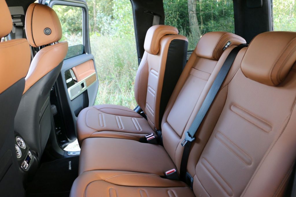 Nuž, nastúpme… treba sa vyhupnúť mierne nahor a prekonať prahový schodík a poriadne buchnúť dverami. Ich zvuk patrí k ikone neoddeliteľne. Prahový schod sa asi najviac osvedčí ako ochrana pred dverami okolo parkujúcich áut. Prvý dojem zvnútra – dostatok miesta, žiadna stiesnenosť. Áno, najnovšia verzia je širšia o 12 cm a vo vnútri sa to prejavilo pozitívne. Ostatné rozmery sú v poriadku, nad hlavami aj vzadu, vďaka rovnej streche si pohodlne sadnete aj v cylindri. Prístrojový panel vás okamžite prinesie do 21. storočia. Dva velikánske konfigurovateľné displeje (obidva 12,3″), jeden v priehľade volantom, druhý uprostred palubnej dosky (ukáže napr. aj náklony, zrýchlenia a pod.). Samozrejme, na stredovom tuneli má svoje miesto klasický „mercedesácky“ touch pad so všetkými ovládačmi ako v limuzínach najvyššej triedy. Skvelý zvuk audiosústavy Burmester. Koža, hliník, drevo. Pohodlie, prehľadnosť, precíznosť, vynikajúce materiály, krásne dizajnérske detaily. Všetko špičkové na pohľad i ohmat. Vrátane robustnej rukoväte pred spolujazdcom. Verte, zíde sa!