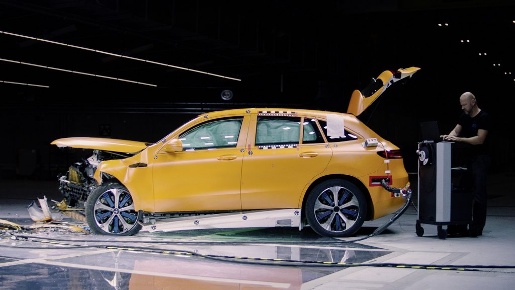 Bezpečnosť vozidla EQC v prípade nehody bola overená v novom technologickom stredisku pre bezpečnosť vozidiel Mercedes-Benz (TFS), teda v najmodernejšom centre nárazových skúšok na svete, kde sa v ťažkých nárazových podmienkach testujú aj prototypy s elektrickými akumulátormi. Výsledkom testov je komplex konštruktívnych opatrení, ktoré sa starajú o vysokú úroveň bezpečnosti pri nehode novej EQC.