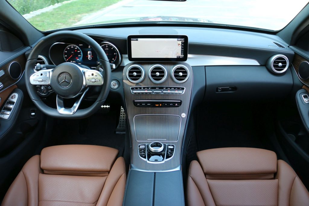 Ak sme v redakcii triedu C za niečo kritizovali, bol to displej infotainmentu s nevkusným hrubým plastovým rámom. Ten našťastie vystriedal oveľa krajší, širokouhlý displej prekrytý sklom. Novinka sa usídlila aj do kaplnky prístrojov – miesto analógových budíkov sa tu teraz nachádza digitálny displej. Veľmi chválim, že nejde iba o hranatú plochú obrazovku, ako je to v prípade triedy E a vyšších. Displej je tvarovaný podľa pôvodnej kaplnky. Na stredovom tuneli chýbal dotykový ovládač, za ktorý by som si priplatil čisto pre možnosť zadávať adresy a mená písaním naň. Na ostatné úkony stačí klasický otočný viacpohybový ovládač. Po novom sa dá v rôznych menu navigovať aj dotykovými plôškami na novom volante, ktorý je prevzatý z triedy S. To je asi najjednoduchší a najbezpečnejší spôsob. Ľavou plôškou ovládate prístrojový panel, pravou hlavný displej. Zvyšok interiéru je veľmi podobný, ak nie identický s modelom pred faceliftom. Akurát miesto troch farieb ambientného osvetlenia si teraz môžete vybrať z celej farebnej škály.