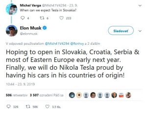 „Dúfam, že začiatkom budúceho kalendárneho roka, otvoríme na Slovensku, v Chorvátsku, Srbsku a viacerých ďalších východoeurópskych krajinách naše predajne. Sme hrdí na to, že budeme predávať automobily v rodnej krajine Nikolu Teslu,“ napísal Musk na Twitteri.