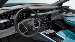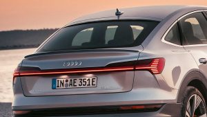 Oranžovou farbou, ktorá upozorňuje na vysokonapäťové komponenty, sa leskne nápis na viečku elektrickej zásuvky pre nabíjanie, na prianie sa k nemu môžu pridať aj brzdové strmene. Podľa metodiky WLTP ujde SUV v štýlu kupé na jedno nabitie akumulátorov až 446 km. Predĺženie dojazdu o 10 km v porovnaní s modelom e-tron má na svedomí optimalizovaná aerodynamika. Ďalším priaznivým faktorom pre hospodárnu prevádzku sú na želanie dodávané virtuálne vonkajšie spätné zrkadlá, v ich krídlovitých nosných prvkoch sú uložené malé kamery.