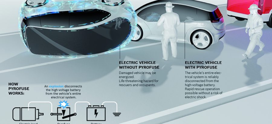 Akumulátor pod prúdom môže pri nehode spôsobiť vážne zranenie nielen posádke, ale neskôr aj záchranárom. Hrozí nielen úraz elektrickým prúdom, ale aj požiar. Dnes sa akumulátory pri väčšej nehode z bezpečnostných dôvodov vyskratujú. Ibaže tým sa znehodnocujú, nedajú sa totiž opraviť. Bosch prichádza s inovatívnou myšlienkou pyrotechnického odpájania akumulátora. Keď snímače potvrdia náraz presahujúci stanovenú hranicu, vyšlú signál do pyrotechnickej nálože, ktorá riadenou explóziou odpojí vysokonapäťový kábel od zvyšku vozidla. Všetko sa to udeje v zlomku sekundy.