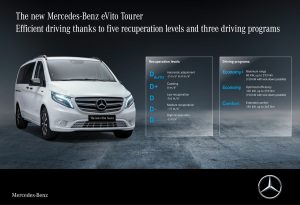 Tri jazdné programy navyše umožňujú šoférovi individuálne si zvoliť aktuálny dojazd v závislosti na vybranom jazdnom režime. Batéria umiestnená pod podlahou nijako neobmedzuje vnútorný priestor, preto eVito Tourer spĺňa všetky požiadavky na funkcionalitu a variabilitu interiéru, čím umožňuje akékoľvek využitie na prepravu cestujúcich. Je možné objednať si auto v dvoch dĺžkach – v základnej s celkovou dĺžkou 5140 mm, alebo v extra dlhom variante s 5370 mm. Spoločnosti zaoberajúce sa napríklad prepravou osôb a cestujúcich, ako napr. taxislužby, využijú rozličné varianty nastavenia sedadiel.