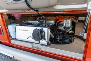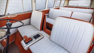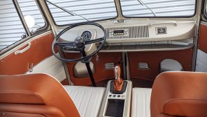 Podlaha je kompletne vyrobená z masívneho dreva a svojim vzhľadom pripomína paluby plavidiel. V spojení s prívetivo svetlými odtieňmi kože tým tento elektrifikovaný Samba Bus získal prímorský charakter. Uvedený dojem ešte umocňuje veľké panoramatické posuvné strešné okno. Citlivých úprav sa dočkala tiež prístrojová doska. Originálne pojatie preberá nový rýchlomer, do ktorého je integrovaný dvojriadkový displej vytvárajúci spojenie so súčasnosťou. Digitálny displej v inak analógovom rýchlomere informuje šoféra okrem iného aj o maximálnej dĺžke dojazdu.