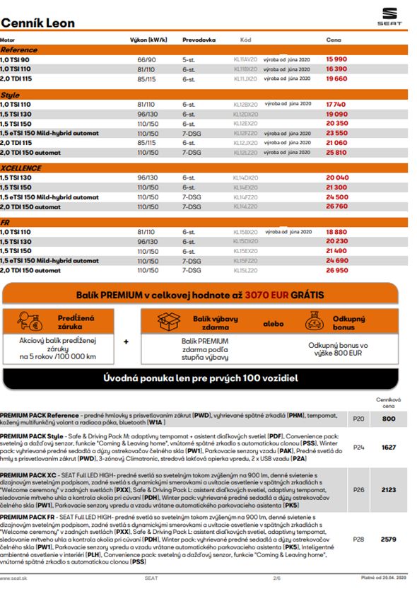 Ponuka modelov je široká. Aktuálne ju tvorí ju šesť motorov, tri prevodovky a štyri stupne výbav. Čo sa motorizácie týka, na výber máte benzínové motory 1,0 TSI 90; 1,0 TSI 110; 1,5 TSI 130 a 1,5 TSI 150, mild-hybrid 1,5 eTSI 150 a dieselové 2,0 TDI 115 a 2,0 TDI 150. Samozrejmosťou sú manuálne a dvojspojkové automatické prevodovky. Výbavové stupne sú Reference, Style, Xcellence a FR. Medzi obrázkami nájdete kompletný cenník aktuálne dostupných modelov. Pravda, niektoré verzie sa začnú vyrábať neskôr, v júni 2020.