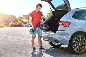 Potom meria len 49 x 42 x 11 centimetrov. Zloženú kolobežku je možné uložiť v kompaktných modeloch Škoda Scala a Škoda Kamiq do priehlbiny pre náhradné koleso, pokiaľ je vozidlo vybavené lepiacou sadou pre núdzovú opravu defektu. Celý objem batožinového priestoru zostáva aj potom zachovaný pre uloženie batožiny.