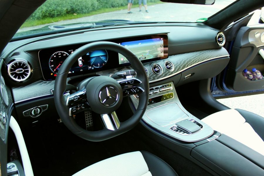 Vyskúšali sme si aj naftovú šesťvalcovú verziu E 400 d s výkonom 243 kW (330 k) v nádhernej karosérii kupé , v sýtej modrej farbe. Všetko, čo má číselne označenie menej ako 400 je v tomto prípade štvorvalcová pohonná jednotka. Kúpe verzia, už tradične, nemá žiadny stĺpik, a nie je prítomné ani krútenie karosérie. Veď kto by to v dnešnej dobe ešte čakal. Motor je spárovaný s 9 stupňovou automatickou prevodovkou a pýši sa zaujímavou porciou krútiaceho momentu 700 Nm a to v spektre od 1 200 – 3 200 ot.min-1.