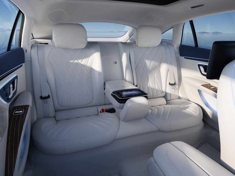 Hoci EQS je blízkym príbuzným novej triedy S, jeho nová elektrická platforma umožnila prísne účelný dizajn. Vďaka tvaru karosérie s jednou dominantnou líniou a vpred posunutou kabínou je EQS jednoznačne odlíšiteľné od modelov so spaľovacím motorom. Prístrojovému panelu vo vnútri dominuje veľký, zakrivený hyper-displej siahajúci od pravého až k ľavému prednému stĺpiku. Pre spolujazdca je tu ďalší displej s uhlopriečkou 12,3“.