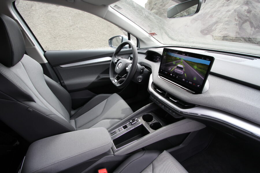 V interiéri elektromobilu má vodič sprvoti pocit, akoby ani nesedel v škodovke. Textilné čalúnenie palubnej dosky sa ťažko porovnáva s akýmkoľvek iným modelom značky, no zopár spoločných prvkov je možné objaviť. Napríklad 13-palcovú centrálnu obrazovku aj dotykový slajder pod ňou už dobre poznáme. Zvyknúť si sme naopak museli na neveľký displej digitálneho kokpitu, ktorý zobrazuje len základné údaje. Ide o podobné riešenie ako využíva Volkswagen ID.3 alebo ID.4. Pochváliť chceme vnútorný priestor aj celkovú ergonómiu. Z Enyaqu iV je jasne cítiť, že má snahu byť plnohodnotným rodinným autom. Azda najviac je táto snaha viditeľná na zadných sedadlách, kde má aj dvojica dospelých cestujúcich dostatok miesta v každom smere. Zabúdať netreba ani na rozmerný batožinový priestor, ktorý k značke Škoda patrí. V Enyaqu iV má objem slušných 585 litrov.