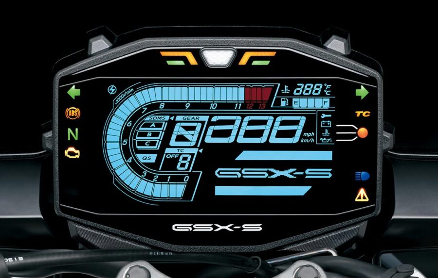 Okrem množstva informácií nájdete na prepracovanej LCD obrazovke na prístrojovom paneli aj grafické prvky a modré podsvietenie na zvýraznenie vzhľadu modelu GSX-S1000. V súlade s agresívnym štýlom motocykla displeju dominujú údaje o otáčkach, rýchlostných stupňoch a okamžitej rýchlosti, ale na ľahko čitateľnom prístrojovom paneli nájdete aj rôzne nastavenia a ďalšie možnosti. Zväčšili palivovú nádrž, takže vďaka objemu 19 litrov budete mať viac slobody medzi tankovaniami a pri dlhších jazdách určite využijete aj tankvak z ponuky príslušenstva. Nové sedadlo navrhli so zreteľom na čo najlepší zážitok z jazdy a slobodu pohybu, takže jazdcovi a spolujazdcovi zaručuje súčasne športové a pohodlné sedenie. Konštrukcia ponúka lepšiu oporu a na zadné sedadlo možno v prípade potreby nasadiť kryt, ktorý ešte viac zdôrazní športový vzhľad motorky.
