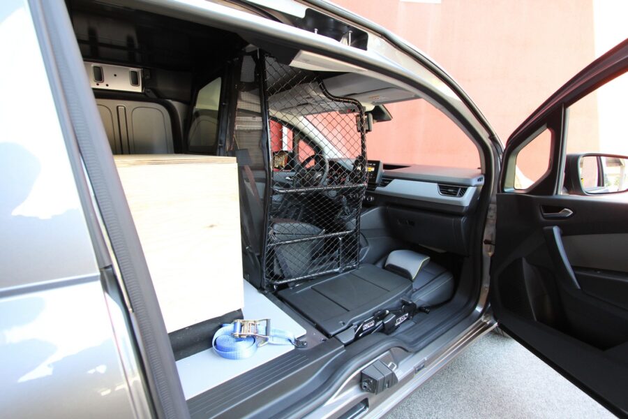Absolútnou unikátnosťou je karoséria bez B-stĺpika na strane spolujazdca – Open Sesame by Renault a práve takú verziu som si aj vyskúšal. Môžem potvrdiť, že tuhosť karosérie nijako neutrpela. Po otvorení dverí síce žiaden B-stĺpik nie je vidieť, no v skutočnosti je integrovaný do dverí spolujazdca a do posuvných dverí. Na prahu aj v strope je mohutný kotevný mechanizmus, takže tuhosť karosérie aj pasívna bezpečnosť pri bočnom a akomkoľvek inom náraze, vrátane prevrátenia vozidla, sú vraj rovnaké ako pri štandardnej karosárskej verzii. Konštruktéri však museli zapracovať na zvýšení statickej tuhosti, pretože sa karoséria nesmie ohnúť ani vtedy, keď sú dvere spolujazdca a bočné posuvné dvere otvorené. Testované vozidlo malo naložených 280 kg a skúšal som ho postaviť šikmo na obrubník, otvoriť oboje bočných dverí a potom zatvoriť. Žiaden problém, dvere sa otvárali a zatvárali ako keď som stál na rovine. Mimochodom, dvere spolujazdca sa otvárajú v uhle 90 stupňov a rovno dodávam, že identický uhol otvárania majú štandardne aj dvere vodiča. Kangoo Van sa totiž často používa na prestavbu pre telesne postihnutých a tí potrebujú veľký uhol otvorenia dverí. A načo je komu vlastne systém otvárania dverí Open Sesame? Remeselníkom, ale aj doručovateľom sa neraz stáva, že musia z auta vybrať nejaký dlhý predmet (pri otvorení prepážky je ložná dĺžka až 3,05 metra), ale keď zaparkujú v meste medzi autá, tak je to zozadu prakticky nemožné. Keď však otvoria oboje bočných dverí, potom je to hračka. Ďalším príkladom sú remeselníci, ktorí môžu mať vo vozidle inštalované vybavenie – napríklad stolík s náradím, ktorý je tak veľmi ľahko dostupný priamo z bočnej strany vozidla, teda od chodníku. A presne takéto vozidlo mal Renault vystavený. Po otvorení oboch bočných dverí sa otvorí vstupný otvor s dĺžkou 1 446 mm, čo je bezkonkurenčne najviac v triede. Dodávam, že systém Open Sesame si môžete zvoliť iba ku kratšej karosárskej verzii a vždy sa dodáva so sklápateľným spolujazdcovom sedadlom s variabilnou deliacou priečkou.