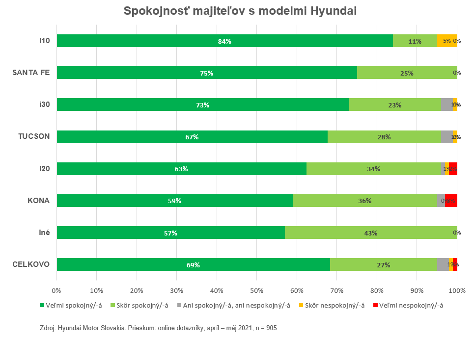 Spokojnosť s vozidlami Hyundai podľa prieskumu Hyundai Motor Slovakia z apríla a mája 2021 s účasťou 905 majiteľov a majiteliek – fyzických osôb, ktoré svoj automobil zakúpili ako nový u autorizovaného predajcu Hyundai na Slovensku: