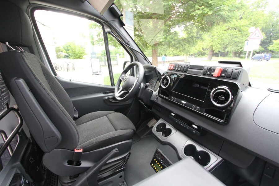 Aby som nerozprával do vzduchu, vyskúšali sme si obe verzie. Sprinter City 75 v novej výbave Interurban s 19 miestami na sedenie, 14 miestami na státie a jedným miestom na kolesové kreslo telesne postihnutého a s príslušnou nástupnou rampou a širokými dverami vpredu pre ľahšie nastupovanie. Ďalšie dvere boli vzadu. Vodič má v sérii vyhrievané a odpružené sedadlo, systém MBUX so 7- alebo 10,25-palovým dotykovým displejom. Na pohon slúžil turbodieslový štvorvalec OM 651 s 2 143 cm3, vyladený na 120 kW (163 k) pri 3 800 ot.min-1, a 360 Nm pri 1 400 – 2 400 ot.min-1, ktorý spolupracoval s automatickou prevodovkou 7G-Tronic Plus s hydrodynamickým meničom. Ten zabezpečoval hladký rozjazd z miesta, ale aj pokojné posúvanie sa za autami v zápche.