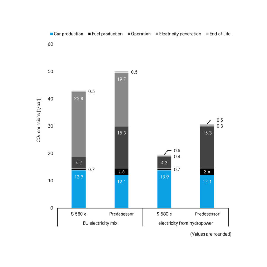 Okrem lepších hodnôt emisií CO2 vykazuje model S 580 e oproti svojmu predchodcovi aj výhody v oblasti eutrofizácie (EP) a potenciálu letného smogu (POCP). V dôsledku vyššieho podielu použitej elektrickej energie sa podarilo znížiť spotrebu fosílnych zdrojov (ADP pre fosílne suroviny) o 16 percent (Európsky energetický mix), resp. 59 percent (elektrina z vodných elektrární).