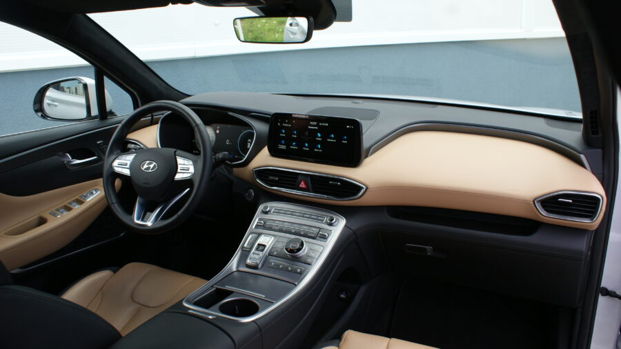 Zmeny, ktoré nastali v interiéri, sú tiež radikálne. Veď masívny stredový tunel s veľkým množstvom tlačidiel udrie do očí každému a hneď. Chválime množstvo úložných priestorov, alcantarou čalúnený strop, ale aj kombináciu béžovej a čiernej kože. Masívne predné sedadlá sú pohodlné a nechýba im funkcia vyhrievania i odvetrávania. V nami testovanom kuse sa nachádzalo klasických päť sedadiel, avšak Santa Fe môžete mať aj v 7-miestnej verzii. Keďže ide o robustné SUV, palec hore dávame za obraz kamery v digitálnom prístrojovom štíte pred vodičom pri vyhodení smerovky. Okrem eliminácie mŕtveho uhla kamera pomáha aj pri parkovaní k obrubníku.