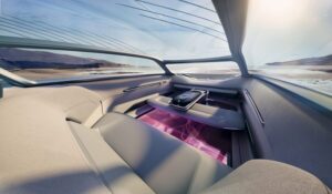 Vnútri modelu L100 Concept je akási obývačka alebo salónik. Okamžite si všimnete, že chýba volant, a to preto, lebo tento koncept je v podstate autonómne vozidlo. Určitú kontrolu však zrejme dostanú cestujúci. Lincoln sa môže pochváliť interiérom vyplneným eko materiálmi a recyklovanou semišovou látkou. Podlaha je obrovská obrazovka a predné sedadlá sa dajú otočiť, aby sa auto skutočne zmenilo na salónik. Rovnako ako v prípade iných luxusných konceptov k dispozícii je množstvo svetiel, zvukov a aróm na vytvorenie toho, čo sa nazýva svätyňa.