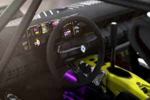 Rovnaká žltá farba sa miesi s ružovou a zvýrazňuje šedo-čiernu tartanovú zmes aj na palubnej doske. Tartan je doplnený vizuálnym efektom vychádzajúcim z loga Renault. Ten sa zobrazuje tiež v osvetlenej verzii na pravej strane náboja volantu. Všetky tieto farebné efekty sú tiež v kontraste s čiernou korkovou podlahou a Alcantarou pokrývajúcou hornú časť palubnej dosky a dverí.