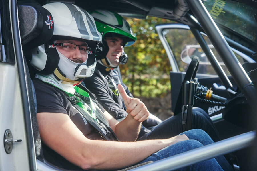 Z 200-vky RS sme plynule prešli do Fabie RS Rally2. V nej nás povozil Jan Kopecký, majster sveta 2018 v kategórii WRC-2, majster Európy 2013, niekoľkonásobný majster Českej republiky v rely. Po usadnutí som ostal prekvapený, ako nízko sa v športovom vozidle sedí. Zároveň som si musel dať pozor, aby som nepostláčal nožné tlačidlá, napr. na stierače či klaksón.