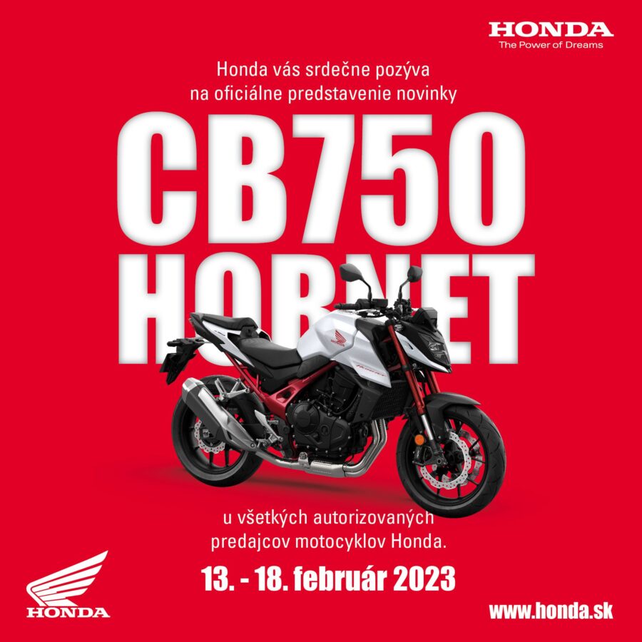 Dlho očakávaná novinka, CB750 Hornet, sa teraz dostáva k našim dílerom! Neváhajte a poďte sa s touto ikonou zoznámiť! Akcia prebieha v termíne od 13.2. do 18.2. 2023 na všetkých autorizovaných dílerstvách motocyklov Honda. Využite možnosti si motocykel do detailu prezrieť a prediskutovať vaše otázky s odborným personálom.