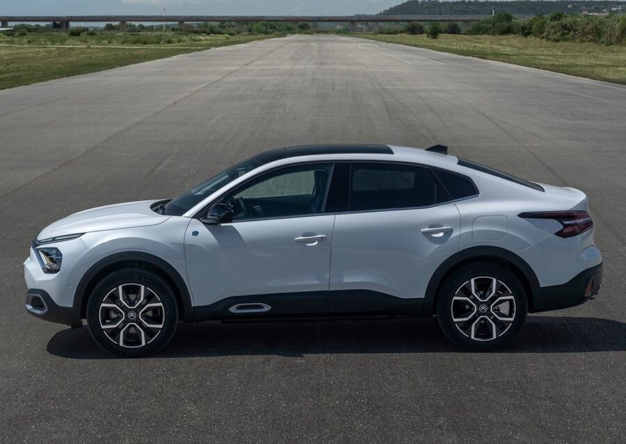 Pri pohľade zboku dynamická línia strechy elegantne prechádza od hornej časti čelného skla k hornému panelu dverí batožinového priestoru a vytvára dobre ukotvenú siluetu fastbacku, ktorá je na hony vzdialená od trochu neohrabaného vzhľadu často vyšších crossoverov, zatiaľ čo zadný previs šikovne zakrýva dĺžku potrebnú na umiestnenie objemného 510-litrového kufra. Aerodynamika je optimalizovaná vďaka rýchlej a čistej línii strechy karosérie, výsledkom čoho je nízky koeficient odporu vzduchu, z čoho profituje aj dojazd a spotreba paliva: ë-C4 X Electric tak podľa cyklu WLTP dôjde do vzdialenosti 360 km.