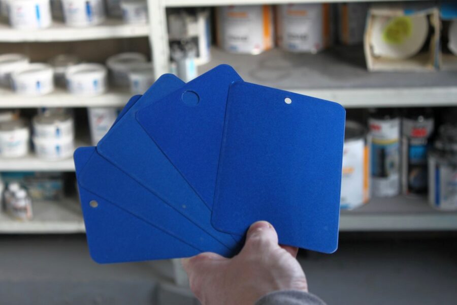 Vždy so spektrofotometrom. Jeden kód farby má množstvo podotieňov. Vymyslím si príklad na ilustráciu. Príde k nám modrá Škoda vyrobená v Boleslavi a príde Škoda s totožným kódom farby, ale montovaná v Kvasinách. A rozdiel vo farbe je skutočne výrazný! Pozn. redakcie: Do toho nám Branislav ukázal test karty s rôznymi modrými farbami určenými práve na Fabiu a pod správnym uhlom bolo rozdiely skutočne vidno aj našimi necvičenými očami.
