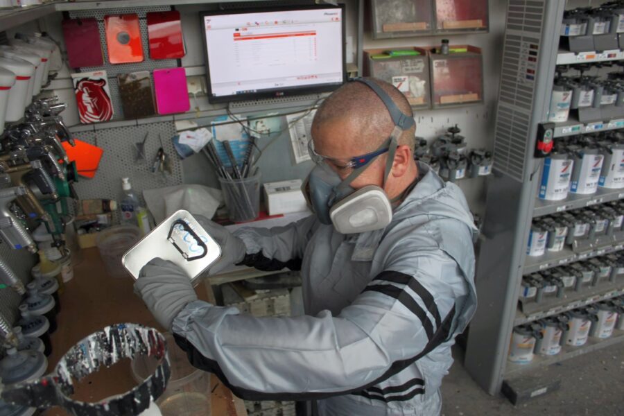 Teplo si môžeme v boxe regulovať. Vlhkosť sa však nedá odstrániť ani ovplyvniť. Preto máme vlhkomer a práve na základe údajov mierne upravujeme zloženie farby, aby sedel podotieň. Je iné striekať, keď je vzdušná vlhkosť 30 % a iná, keď je 65 %.