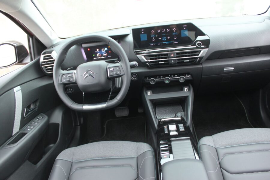 Interiér sa vyznačuje čistotou línií a Francúzi tradične kládli dôraz na komfort posádky. Chválim fyzické ovládače na nastavenie klimatizácie, len je škoda, že smer prúdenia vzduchu sa dá upraviť jedine cez dotykový displej. Ten má, mimochodom, rozmer 10 palcov a moderný infotainment, aj keď na trhu sú už aj rýchlejšie a prehľadnejšie systémy. Malý digitálny kokpit má 5 palcov a vo vyšších výbavách je doplnený o head-up displej s obrazom premietaným na výklopné sklíčko, ktoré má však v zime sekavé pohyby pri prvom vyklopení. Vtipným detailom je integrovaný držiak na tablet pred spolujazdcom. Priestoru pre štyroch cestujúcich je v C4-ke dosť, mierne obmedzujúca je akurát šírka, no v rámci triedy ide o štandard. Ku komfortu počas jazdy prispievajú aj tlmiče s hydraulickými dorazmi, vďaka ktorým auto hladko filtruje väčšinu nerovností. Vzadu má Citroën iba jednoduchú zadnú nápravu, ale aj v komplikovanejších zákrutách zostáva auto stabilné. Počas jazdy mi chýbala azda len funkcia Auto-Hold a automatická prevodovka by na pokyny od voliča mohla reagovať o niečo rýchlejšie. Naftový motor s objemom 1,5 litra a výkonom 131 koní je tichý a úsporný, čo je ideálna kombinácia.