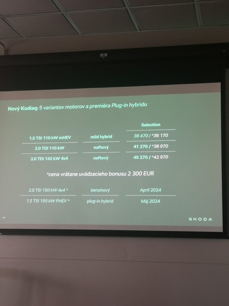 Kodiaq prichádza v rovnakých motorizáciách ako nový Superb, štandardne je k dispozícii so sedemstupňovou prevodovkou DSG a pohonom predných kolies. V prípade výkonnejšej naftovej verzie je štandardom pohon všetkých štyroch kolies. Bohatá základná výbava Selection zahŕňa napríklad LED predné svetlomety s asistentom diaľkových svetiel, stráženie mŕtveho uhla, asistent udržiavania jazdného pruhu, asistent rozjazdu do kopca, rozpoznávanie dopravných značiek so strážením rýchlosti, parkovacie senzory vpredu a vzadu, parkovaciu kameru, 10-palcový virtuálny kokpit, svetelný a dažďový senzor, trojzónovú klimatizáciu Climatronic, vyhrievanie predných sedadiel, bezdrôtové nabíjanie telefónu a mnoho ďalších komfortných aj bezpečnostných prvkov. Cena novej generácie modelu Kodiaq pritom štartuje od 36 170 eur vrátane DPH. V rámci uvádzacej ponuky k výbave Selection nový majiteľ získa paket Convenience v hodnote 1 069 eur, ktorý obsahuje elektricky nastaviteľné sedadlo vodiča s pamäťou, elektricky ovládané piate dvere, ako aj systém KESSY Full pre bezkľúčové odomykanie, zamykanie a štartovanie či alarm so Safe systémom. Štandardný látkový interiér Loft je možné na prianie nahradiť interiérom Lounge, Suite v čiernom alebo hnedom prevedení. Pripravených je aj niekoľko tematických paketov a množstvo ďalších položiek na prianie vrátane ťažného zariadenia s asistenciou pre jazdu s prívesom.