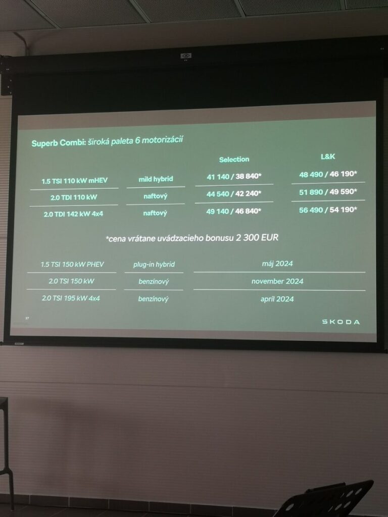 Superb prichádza na trh v karosárskej verzii kombi s jednou benzínovou a dvomi naftovými motorizáciami. Ďalšie pohonné jednotky a tiež verzia liftback prídu na trh ešte v priebehu tohto roku.